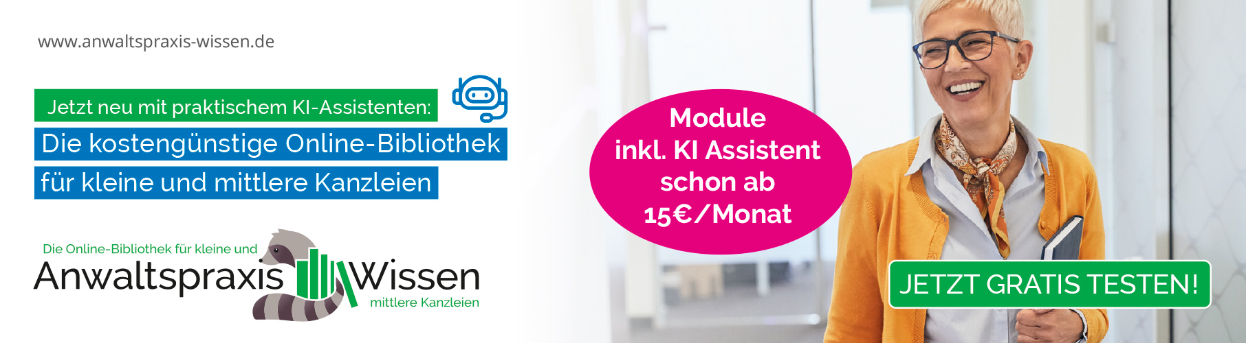 Die smarte Online-Bibliothek für kleine und mittlere Kanzleien: Erhalten Sie sofortigen Zugriff auf über 150 Fachbücher und 13 Periodika aus 16 Rechtsgebieten. Dank des neuen und verbesserten KI-Assistenten finden Sie präzise Antworten blitzschnell – schon ab unschlagbaren 15 €/Monat.